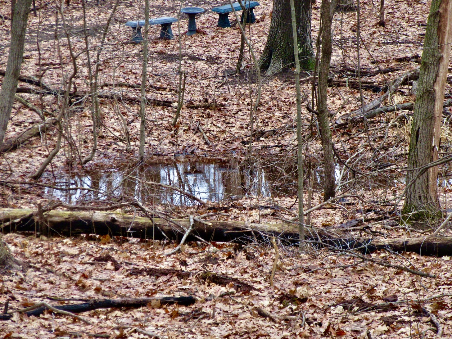 A vernal pool has lately arrived in my forest. It is a temporary body of water that shows up in spring. Vernal pools are where you come to breed. You crawl out of the dark soil, running your limbs along the ground, not caring that your stomach drags. You are free. You survived the winter.